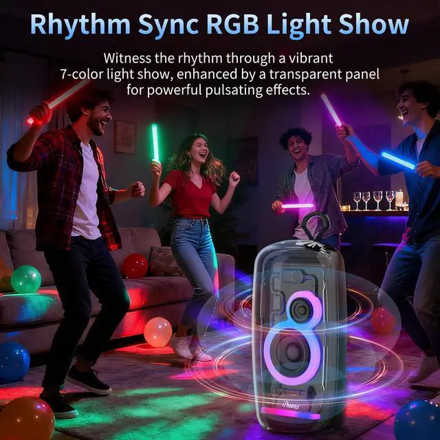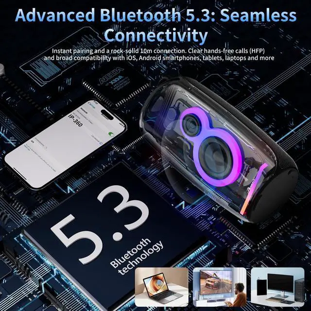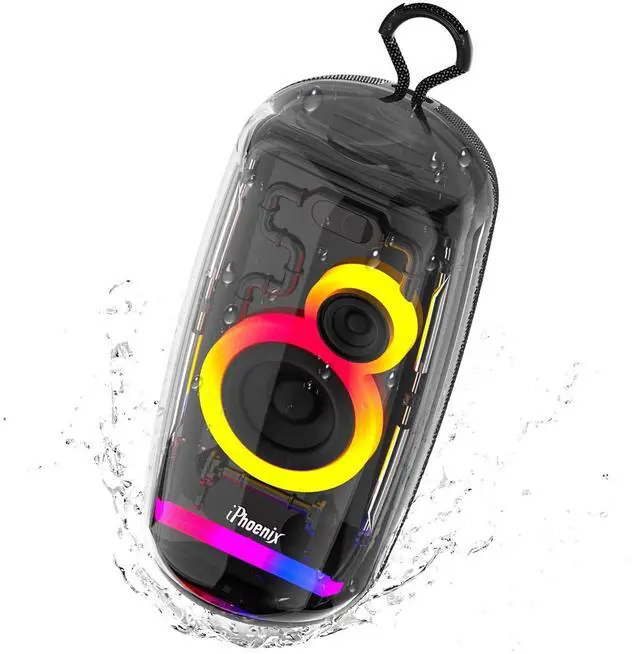 Party Lights: The Iphoenix IP360 Bluetooth Speaker doesn't just play musicit brings it to life. Through its see-through panel, a dynamic multi-color light show pulses and flashes in perfect sync with the rhythm, transforming any space into an electrifying dance club, day or night. With one-touch customization, simply press the dedicated button to cycle through stunning effects and set the scene for an unforgettable party. ^^ 10-Hour Power with Advanced