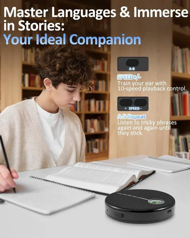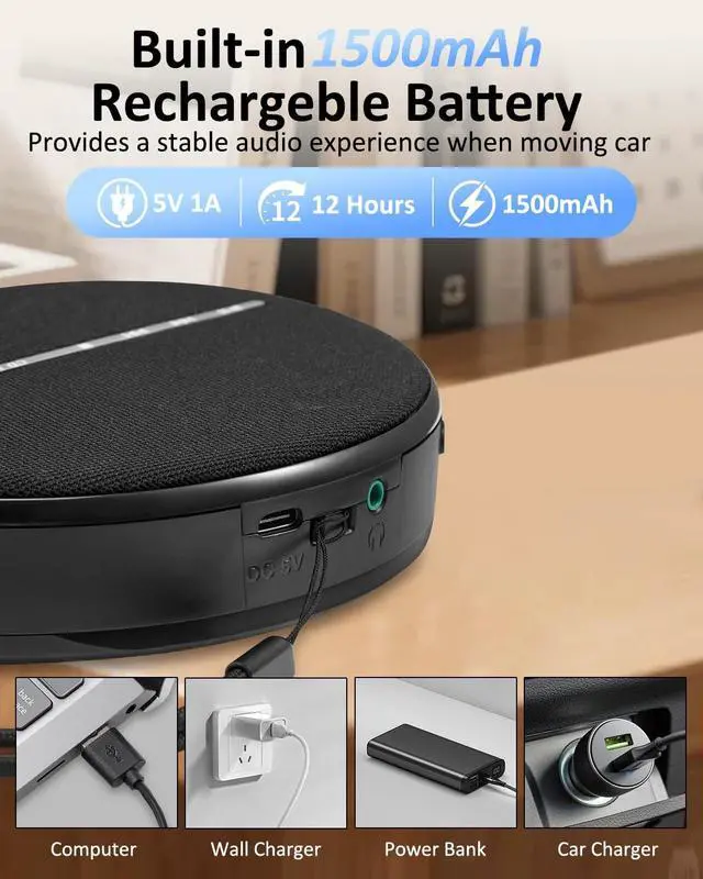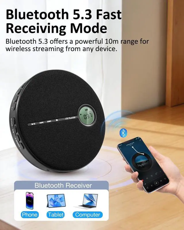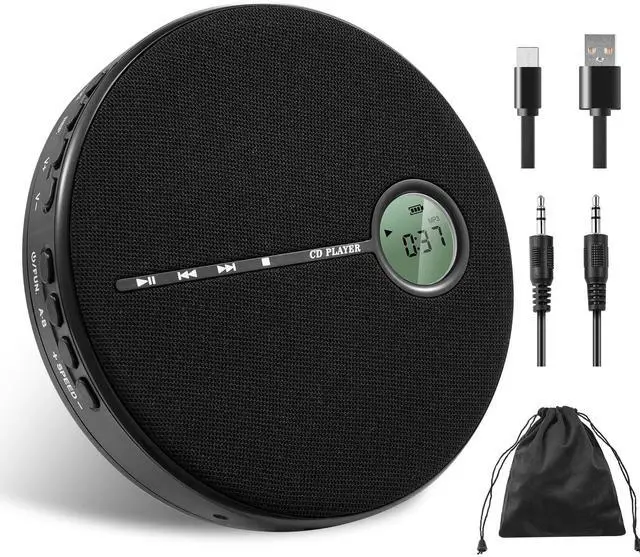 Note: Bluetooth is receiving onlyit cannot transmit. For cd player for car use, simply connect via the included 3.5 mm AUX cable to your car stereo ^^ Long-Life Rechargeable BatteryBuilt-in 1500mAh rechargeable battery gives this portable cd player extended playback. Charges easily via USB-C portuse the same cable as your phone or laptop. Take this discman cd player on road trips or daily commutes without worrying about battery life ^^ Ideal for Language LearningThis discman cd player features 5-level speed control and A-B repeatperfect for studying. Slow down lessons or loop sections with this portable cd player to master any language or music piece ^^ Anti-Skip & Backlit DisplayTake this portable cd player on the goanti-skip protection keeps playback smooth even during movement. The backlit LCD makes this discman cd player easy to use day or night, whether at home or on the move ^^ Multiple Play ModesChoose from Play in Order, Repeat One, or Repeat All on this cd player. Whether you're using this portable cd player for relaxation or learning, customize your listening effortlessly ^^ Stylish Fabric Design & Perfect Gift IdeaThis discman cd player features a unique fabric texturesoft, cozy, and stylish.