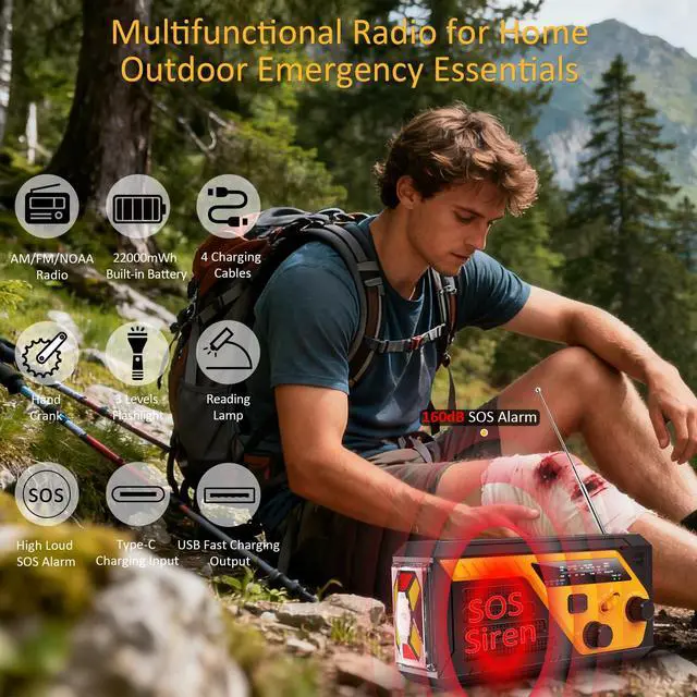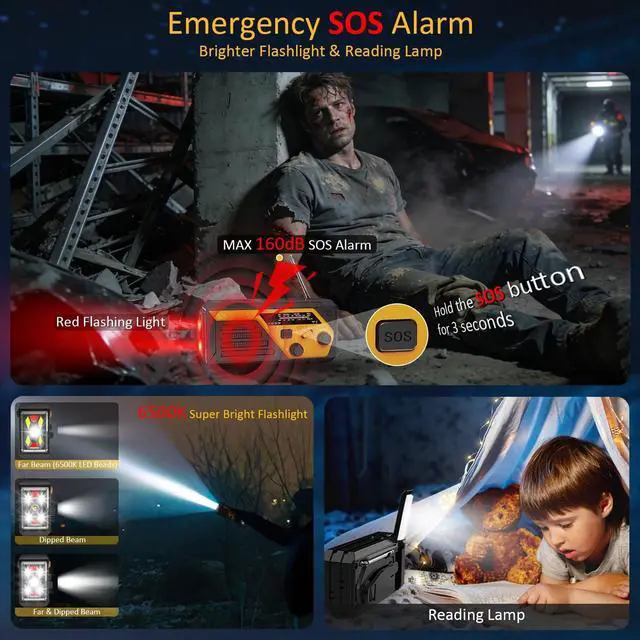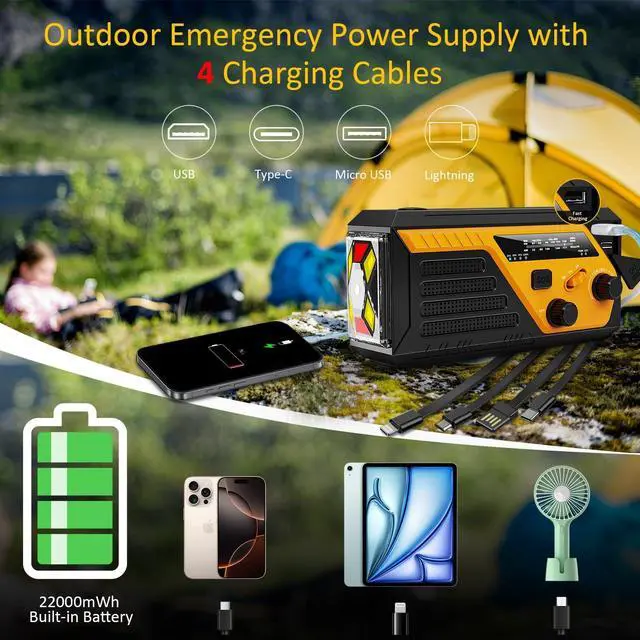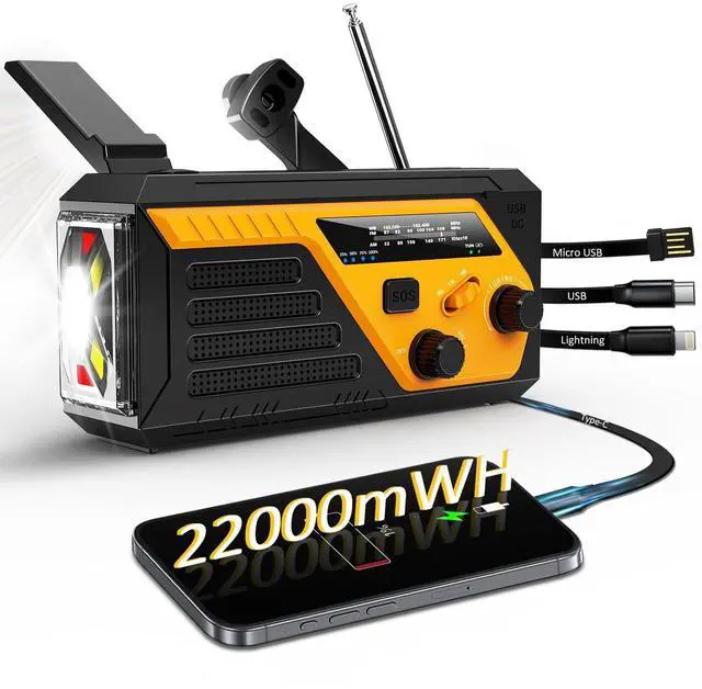 Charging Cables: High-capacity built-in battery provides long runtime. You can charge multiple phones or other devices simultaneously during power outages with USB, Type-C, Micro-USB and Lightning cables. Ideal for home emergency kits and outdoor power backup. ^^ Multiple Input Methods & SOS Alarm: Fully charged via hand-crank, USB, or Type-C to keep the weather radio and flashlight running When off-grid. In an emergency, make the phone call and text by hand crank, long press the SOS button for 3 seconds to activate the red flashing LED and loud siren to attract others' attention for help. ^^ Bright LED Flashlight & Reading Lamp A powerful 3-mode LED flashlight plus a fold-out reading lamp that turns on instantly when opened. Provides long-lasting illumination up to 20 hours on a full charge (low mode), perfect for nighttime reading, camping, power outages or other emergency. ^^ Portable Emergency Radio Lightweight, compact design ( 0.9 Pound; 6.83. 22.7 Inches) included lanyard for outdoor carrying. Intuitive controls AM/FM/WB switch, dedicated flashlight & SOS buttons friendly operation during power outages or on the go as an emergency must-haves.