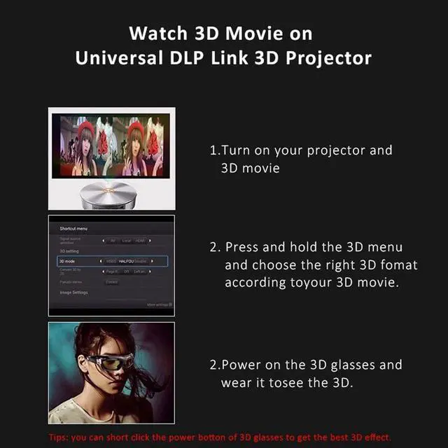 Shutter Technology: The 3D glasses adopt the latest active shutter technology, featuring 144Hz refresh rate, leading other 120Hz or 96Hz products. With just a few simple steps of setup, you can create an immersive 3D 4K home theater.