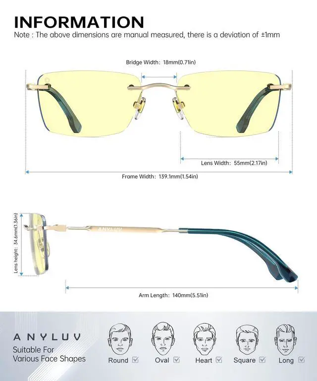 Men & Women: Designed for unisex appeal, Anyluv blue light glasses men and women love combine functionality with minimalist elegance. The frameless design suits all face shapes, making them a gift for professionals, gamers, and students.