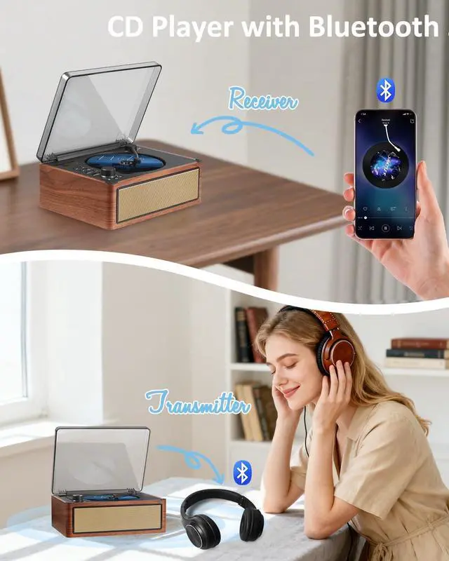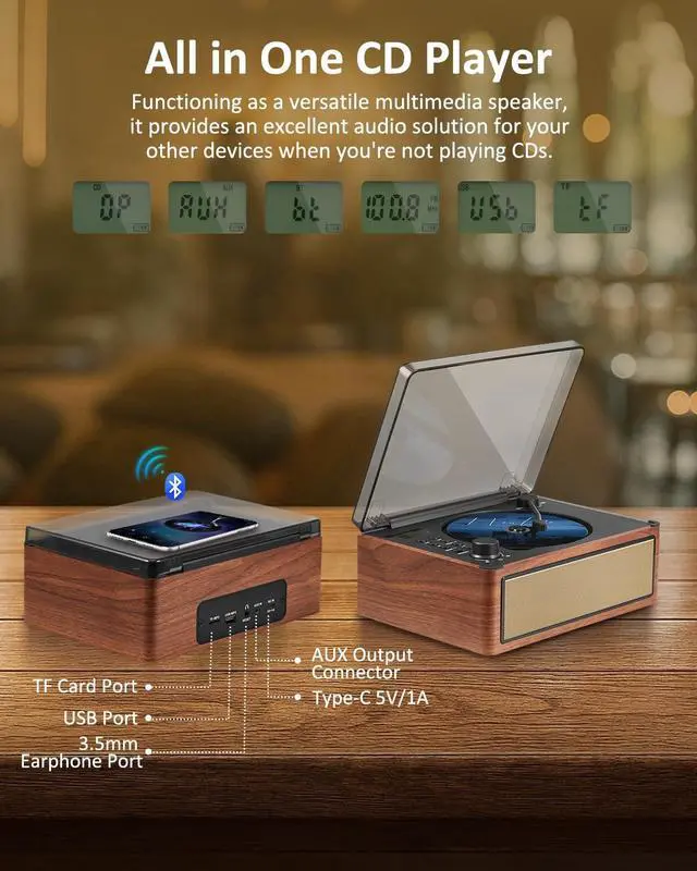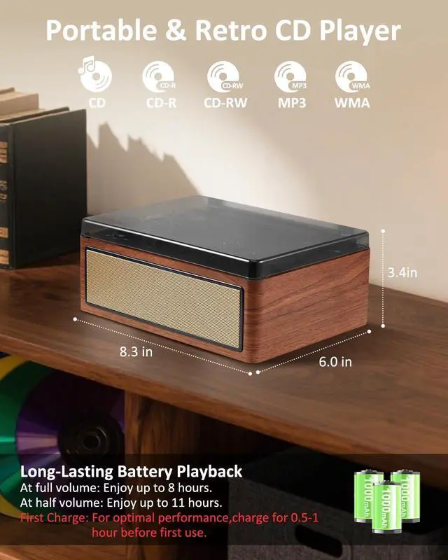 Enjoy multiple audio modes: CD, Bluetooth 5.0 (receive/transmit), FM radio, USB, and AUX input. Plays CD, CD-R/RW, MP3, and WMA formats. Relive classic style while enjoying digital and physical music collections in one sleek device. ^^ [ All-in-One Bluetooth Audio Hub ] Easily stream music wirelessly from smartphones or tablets via Bluetooth to the built-in speakers. As a Bluetooth transmitter, it also sends CD audio to Bluetooth headphones or speakers. AUX input offers extra connectivity for all audio devices. ^^ [ Stereo Sound & Dual Speakers ] Equipped with powerful stereo dual speakers, this player delivers warm, rich, and immersive sound. Stable playback ensures clear audio without interference. Perfect for CDs, radio, or streamingenjoy a seamless auditory experience every time. ^^ [ 3000mAh Battery Powered Portable Music Player ] Built-in a 3000mAh rechargeable battery, this portable player is perfect for outings, picnics, or trips. Share favorite CDs and radio stations with family and friends anytime, anywhereno power outlet needed. ^^ [ User-Friendly Operation ] Features clear LED indicators, a top-loading CD design, toggle switches, voice prompts, a rotary volume knob, and intuitive buttons.