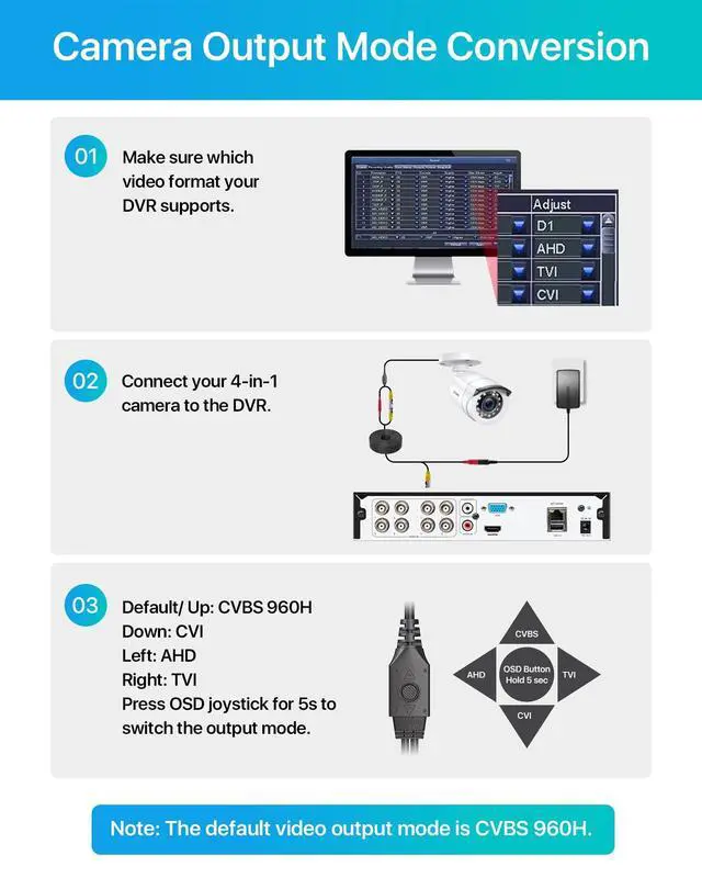 Camera Power Supply and Coaxial Video Cables are not included but they are required and sold separately. ^^ [ Default Video Mode is Analog 960H Mode ] __ Compatible with HD-CVI/TVI/AHD/Analog DVRs. However, if you want to switch to 1080p video mode, please make sure your DVR support 1080p resolution, or it won't show 1080p images. ^^ [ 20/7 Customer Support ] __ Free life-time Tech Support & Any problems, please just feel free to contact us, you can always rely on our 20/7 customer service. (Customer Support response within 20 hours everyday)