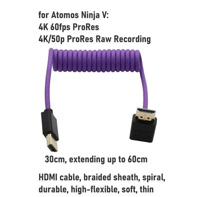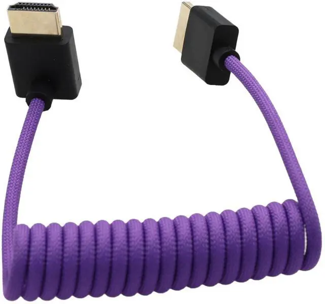 HDMI 8K 4K high speed cable for camera to monitor. Support 8K/60P 30P, 6K 60p 30p, 4K 120fps 4K/60P 4K50/30p, 2K/144Hz, 7680 x 4320 (30p), 3840 x 2160 (60p / 50p / 30p / 25p / 24p), 1920 x 1080 (60p / 50p / 24p), 2160p ultra HD and 1080p HD resolution. HDMI Cable for Sony A7IV & Atomos Ninja V: 4K 60fps ProRes ^^ 4K/50p ProRes Raw Recording ^^ [Compatible DSLR camera] For Sony A1 II, A9 III, A7R V, FX2, FX3, FX30, A7S III, A7 IV, FX6, FX9. For Canon R1, R5 Mark II, C80, C70, C300 III, C500 II, C400. For Nikon Z9 Z8 Z6III. For Pana-sonic Lumix BGH1, S5II, S5IIX, S1RII, G9 II, G9, GH5II GH5M2, GH7, GH6, GH5, GH5S, S1IIE, S1II, S1H, S1R, S1, BS1H, AU-EVA1. For Blackmagic URSA, BMPCC 4K / 6K Pro. For Fujifilm Fuji GFX100 II, X-H2S, X-H2. For Z CAM E2-S6/F6/M4 Mark II, E2-F6 Pro, E2C, E2-F8 ^^ [Compatible monitor recorder] For Atomos Ninja V Shinobi Ultra Inferno, for Feelworld F7/F6PLUS F5Pro LUT6E Cut6, for SmallHD Ultra Cine Indie 5/7 702, for Portkeys BM5IV BM7IIDS PT5II LH7P LH7H LH5PII PT6, for Blackmagic video assist 4K 12G HDR, for NEEWER VILTROX Andycine, for Hollyland Mars 400 video transmission receiver transmitter, for Teradek Spark Bolt Bond, for Vaxis storm, TV, laptop computer, projector, gaming console, Xbox, PS5, capture card, home theater ^^ [Cable Feature and Length] Ultra durable, thin, flexible, soft, spiral coil cable made of purple colored braided nylon sheath.