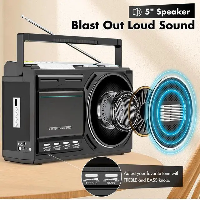 5-Inch Big Speaker Blasts Out Loud Sound: Immerse in the rich, warm sound of our portable cassette player, equipped with a powerful boombox radio speaker and bass/treble adjustment knobs, this cassette tape player boombox produces crisp, balanced sound that brings your favorite cassette tapes to life. Customize the audio to suit your preferences, enhancing the low-end punch or boosting the high frequencies for a brighter tone ^^ USB and