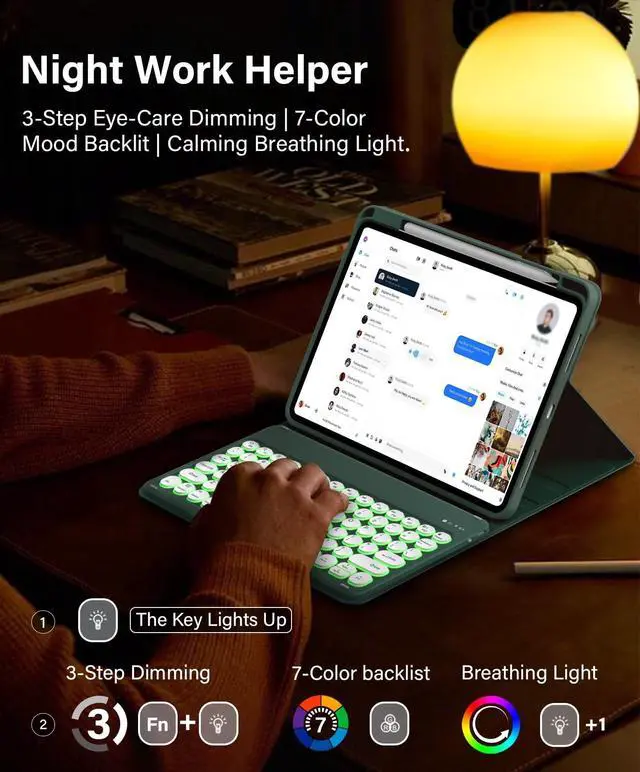 Model Number: A3266/A3267/A3270/A2902/A2903/A2904/A2588/A2589/A2591/A2316/A2324/A2325/A2072. ^^ Comfort-Typing + Easier Pen Holder25 Ergo-Hug circular keycaps wrap you in Cloud-Cushioned Press & Bounce as Cat's-paw. Side holder enables 1-tap pencil accesssmooth for long lectures or creative projects. Perfect for iPad Air 11-inch M4/M3/M2 users whose hands stay fresh and work flows better. ^^ Glow-Comfort Backlit7-color backlit with 3-step dimming (30%/60%/100%) eases eye strain. Enhanced by a dynamic breathing lightflowing gently as you type. This smart combo is ideal for iPad Air 10.9" 4th/5th Gen users working late or studying in dim light. Gentle light, happier eyes.