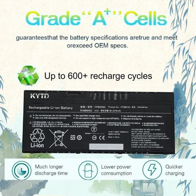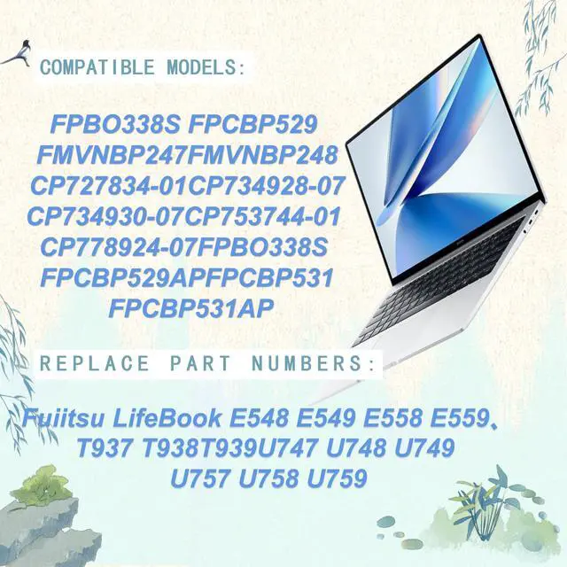 TRUE CAPACITY, LASTING PERFORMANCERigorously tested to match OEM standards, this Li-ion battery delivers a true 50Wh- 14.4V capacityso you get dependable power that wont fade when you need it most. ^^ BROAD COMPATIBILITYcompatiable with for Fujitsu LifeBook T937 T938 T939 E548 E549 E558 E559 U747 U748 U749 U757 U758 U759 ^^ part numbers: FPB0338S FPCBP529 FMVNBP247 FMVNBP248 ^^ Security All KYTD products have obtained multiple safety certifications and comply with compatibility standards, stringent quality control, and environmental safety requirements (including protection against overheating, short circuits, and overload). We are highly confident in the performance and reliability of our compatible laptop batteries. ^^ Customer First Rest assured with 30 days Refund and 12 months Warranty; 24 x 7 email support. We specialize in providing quality power products and quality customer service.