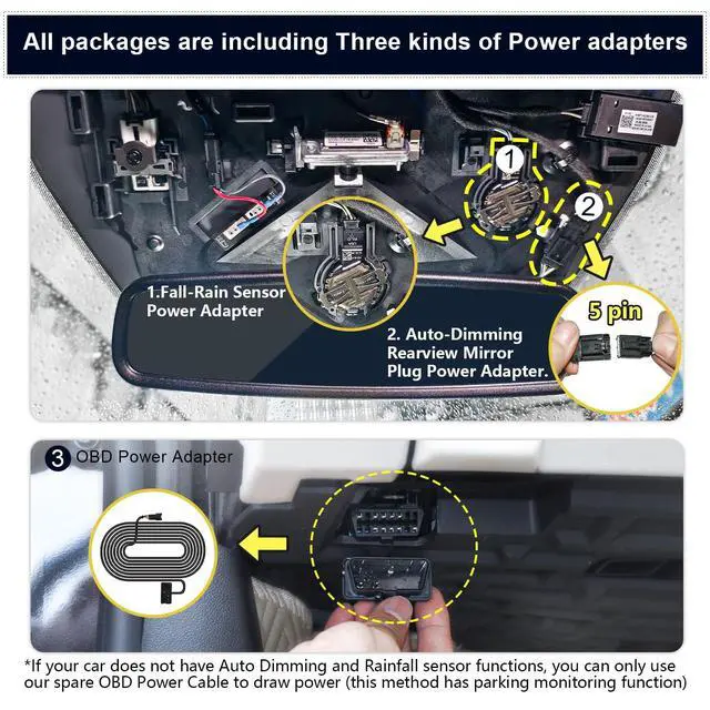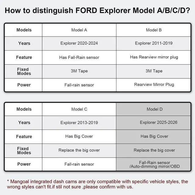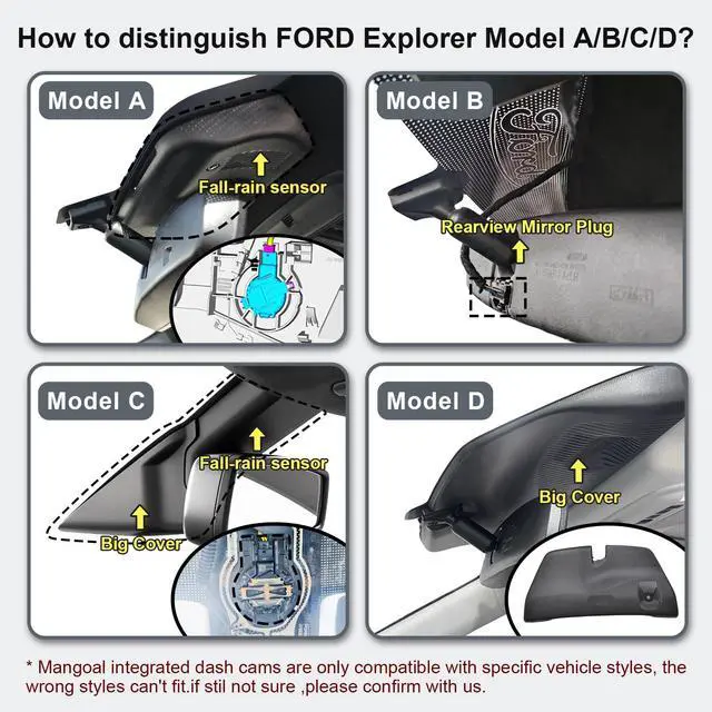Please NoteWe have prepared 3 cables in total, Auto-Dimming PlugAdapter Cable 5pin x1, Rain Fall Sensor Adapter x1. The installation video covers both methods. If you don't have both 2 interfaces, we also have spare OBD Cable. Please check the 4th picture carefully. ^^ Custom fit for Ford Explorer 2025 2026Mangoal 4K dash cam can fit perfectly behind the rear view mirror like original. No messy wiring exposed, no complicated rewire at all. Perfectly intergrated with Ford Explorer U625 2025 2026 vehicle styles. Such as Base, XLT, ST_Line, ST, limited, Timberline, Platinum and King Ranch.