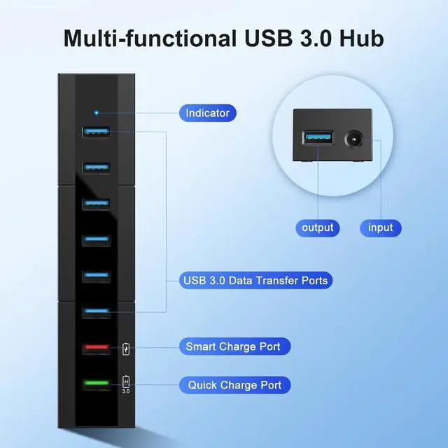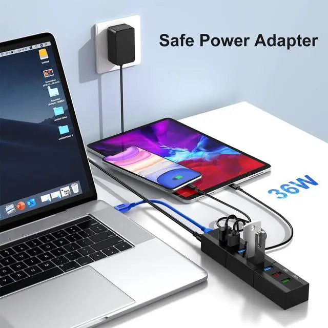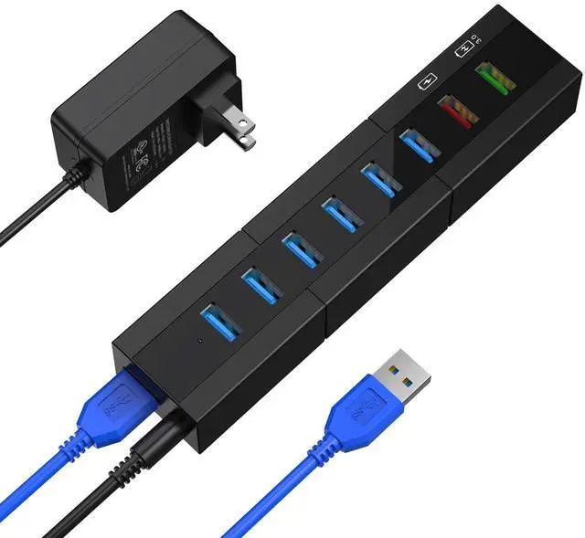 Broad Compatibility: This powered usb hub supports the most operating systems: Windows XP/Vista/ME/7/8/10; MacOS-8/9/X, UNIX, Linux and offers fast plug and play installation; Optimizing BC 1.2 and QC 3.0 charging protocol with high efficiency transmission and charging function ^^