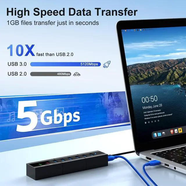 Gbps Fast Data Transfer: The usb 3.0 splitter port provides up to 5 Gbps rapid data transfer speed, 10 times faster than USB 2.0. You can transfer an HD movie in seconds, and it is backwards compatible with USB 2.0 / 1.1; Every port supports Hot Plug ^^ Durable and
