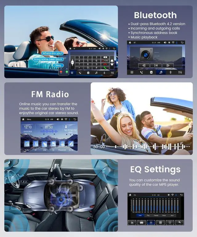 Bluetooth Connection& FM & EQ: The 2 din bluetooth car stereo is equipped with built-in Bluetooth for seamless phone connection, supporting stable hands-free calls and wireless music streamingminimizing driving distractions. FM radio with wide station coverage provides abundant music, news and entertainment content. EQ sound effect function allows personalized audio adjustment, upgrading your in-car music experience to a premium level and creating a customized auditory feast ^^