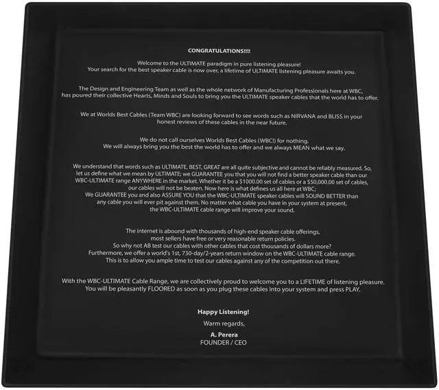WBC Ultimate Assembly Range is a direct result of popular demand by our valued customers, which takes our already excellent cable solutions a step further. With an industry-leading total of 4480, 99.99 % Ultra-Pure Oxygen Free Copper (OFC), 0.08 mm ultra-fine strands, this heavy gauge cable will effortlessly deliver deeper lows, sweet mids and higher highs without any fear of signal loss. Satisfying all the most stringent requirements of the most demanding audiophile. ^^ With the WBC Ultimate Assembly Range of cables, you will experience the best WBC has to offer whilst enjoying the aesthetically pleasing looks these luxury assemblies will bring into your system.