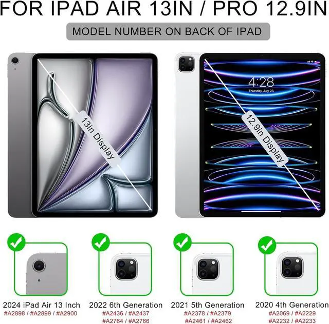 Designed for iPad Air 13" M4 M3 M2 & iPad Pro 12.9" M2 - Exclusively for iPad Air 13 Inch 2026-2024 (Model No.: A3268/ A3269/ A3271; A2898 / A2899 / A2900); iPad Pro 12.9 6th gen 2022 (Model No.: A2436 / A2764 / A2437 / A2766); iPad Pro 12.9 5/4th gen ^^ Designed for Apple Pencil's Magnetic Attachment - Built-in Apple Pencil holder, compatible with the Apple Pencil's magnetic attachment and charging features (Apple Pencil is NOT included!!! ) ^^ Designed for Full Protection - Soft TPU back shell protect your iPad Air 13" M4 M3 M2 Chip & Pro 12.9" Inch M2 Chip from shocks, drops and impacts. Soft microfiber lining with PU leather exterior, prevent your tablet from scratch ^^ Designed for Stable Stand - You can easily prop up the iPad Air 13 inch & iPad Pro 12.9 inch with dual standing positions for enjoying the most comfortable keyboard-typing and movie-viewing ^^ Designed for Auto Sleep/Wake - With built-in magnets, automatically wakes or puts your iPad Air 13 inch & iPad Pro 12.9 inch device to sleep when the lid is opened and closed