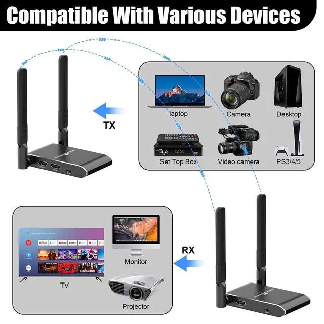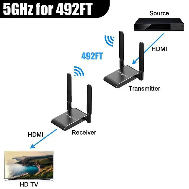 Up to 150m Transmission Range5G high-speed transmission and strong signal. By using wireless transmission technology and through the point-to-point connection between transmitter and receiver equipment, extends 4K full HD HDMI signal wirelessly up to 492ft in an open field without interference.
