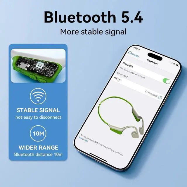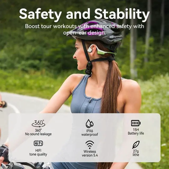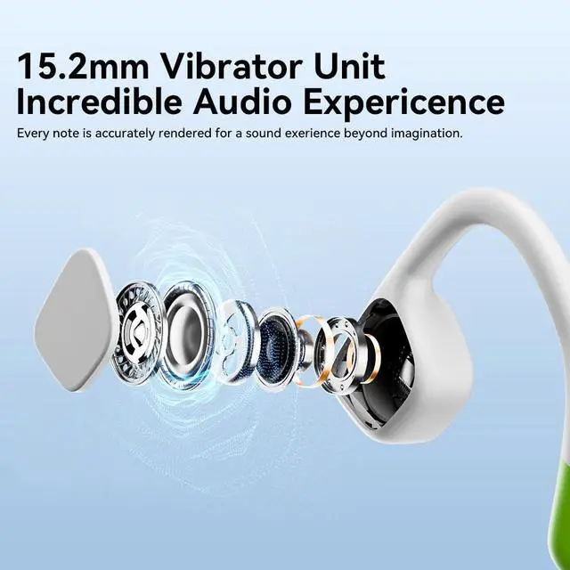[BONE CONDUCTION TECHNOLOGY] Bone Conduction Headphones 15mm speaker driver units, advanced bone conduction technology brings you unbeatable quality audio through your cheekbones, making it possible to fully enjoy your music while still being aware of your surroundings. With improved technology and a fully enclosed cavity, MZYMI bone conduction headphones reduce sound leakage by up to 50%, providing an unparalleled audio experience ^^ [Bluetooth 5.4 ] Wireless Bluetooth 5.4 Open Ear Headphones, improved range, and efficient power consumption for seamless audio streaming. This makes pairing to devices seamless with reduced latency and increased battery life, enabling and reducing sound latency and providing a more stable connection, faster pairing, and universal ^^ [15Hours of Playtime] 15 hours of powerful, 3D audio.