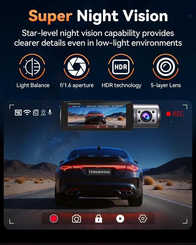 Starlight Night Vision: Equipped with a premium starlight-grade five-layer lens and an ultra-large F 1.6 aperture, enhanced by HDR technology, the dashcam captures clear critical details in low light ^^