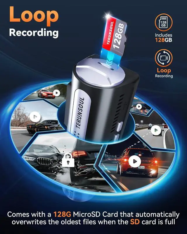 Reliable Accident Capture: Pre-installed with a 128GB Memory Card. When a severe impact is detected by the collision sensor, collision footage is locked and saved automatically. When storage is full, it overwrites the oldest recordings for seamless loop recording ^^