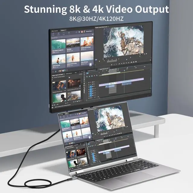 stunning high-resolution output: 8K@30Hz, 5K@60Hz, 4K@144Hz, and 1080p@240Hz. This USB-C to USB-C cable is perfect for connecting USB-C laptops to USB-C monitors, including popular models like LG 4K series, HP EliteDisplay, Dell U2520D/S2719DC/U2421HE/P2419HC, and HP E273d/E27d G4. ^^ 100W Ultra-Fast & Intelligent ChargingBoasting 100W (20V/5A) ultra-fast charging, this USB-C to USB-C cable works seamlessly with 100W/65W/30W USB-C chargers. As a reliable USB-C cable data solution, it's equipped with an exclusive E-Marker smart chip, which intelligently matches the required current to protect your devices from overcharging or current-related damage ^^ Extreme Durability & Stable PerformanceThis USB-C cable features a rugged braided outer jacket, aluminum alloy shell, and nickel-plated plugsensuring stable signal transmission and long-term durability. As a premium USB-C to USB-C data transfer cable, it