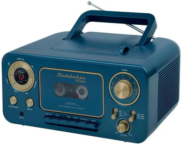 Classic retro design with great features abound on this portable CD player with AM/FM radio and Cassette Player (Recorder), while also featuring Bluetooth to seamlessly stream music, podcasts and other audio from your Bluetooth devices. The top loading CD player is CD-R/RW compatible. The Cassette Player/Recorder has auto stop. Other great features include aux-in jack, condenser microphone and AC/DC operation. The built-in carrying handle makes this portable unit really portable.
