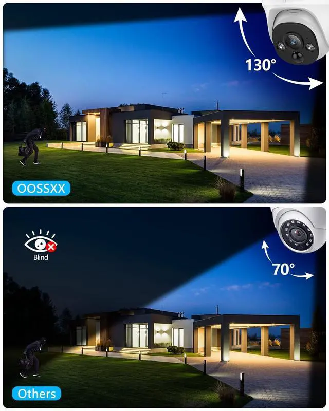 {130 Ultra Wide-Angle Lens Equipped} Outdoor security camera features an advanced 130 wide-angle lens, providing broader coverage and reducing blind spots. Ideal for yards, house, offices, and parking lots that need full-area monitoring.