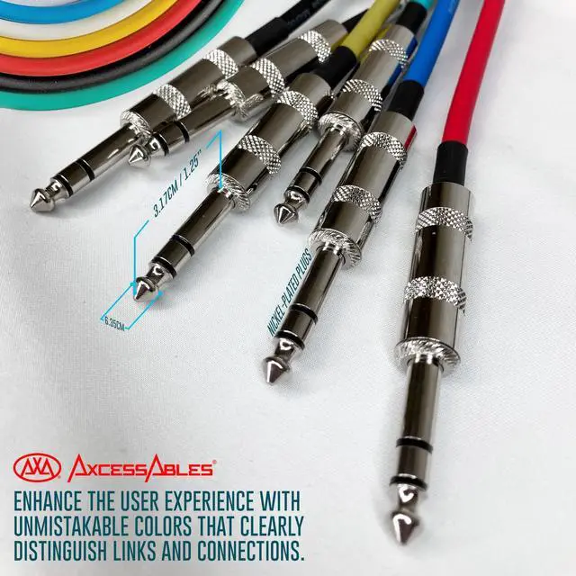 ^^ AxcessAbles color-coded cables are perfect for efficient identification and organization purposes. The use of distinct colors allows for quick and easy recognition, making it simple to differentiate between various cables and streamline your setup. ^^ The TRS 1/4-inch ( 6.35 mm) stereo balanced male-to-male connection is a versatile audio cable for instruments, studios, and various applications. It enables balanced audio connections, links line-level devices, connects effects loops, patches audio systems, and ensures high-quality balanced audio transmission. ^^ AxcessAbles provides a 1-year warranty, ensuring customer satisfaction. Our US-based support team is here to assist you with any technical issues or inquiries you may have.