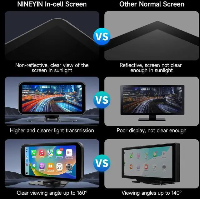 Enhancing Your Driving ExperienceThe 6-inch carplay touchscreen is compact and space-saving, providing a clear front view that prevents obstructing the driver's line of sight; With a resolution of 1440*720 and a touch screen interface, it offers a clear visual experience; The adjustable mounting bracket allows for angle adjustment, further enhancing your safe driving ^^ Wireless Carplay & Android AutoThis car play screen for vehicle supports CarPlay & Android Auto. You can access your phone's music, map navigation, and messages, hands-free phone call etc. When it connects to your phone via Bluetooth or WiFi.