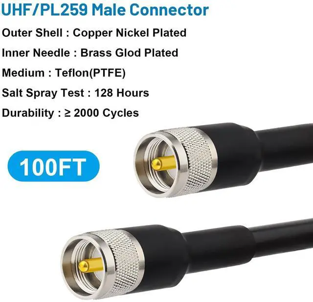 LOW LOSS- The loss of 100ft kmr400 pl259 coaxial cable at 450MHZ signal frequency is less than 2.8 dB and the SWR 1.25. There is no need to worry about signal loss for long-distance high-frequency use. ^^ Well Built Structure] - The inner conductor of this pl259 cable is made of copper clad aluminium, and the outer conductor is made of Aluminum foil and tinned copper braid which could maximum protect the signal over large distance. It could be better in resist oxidation. ^^ Durable- The jacket of this cb cable is made of high-quality PVC, which is waterproof and durable.
