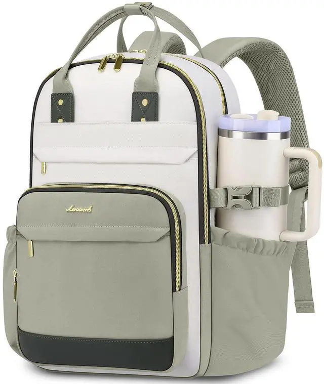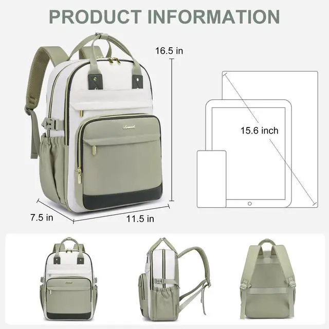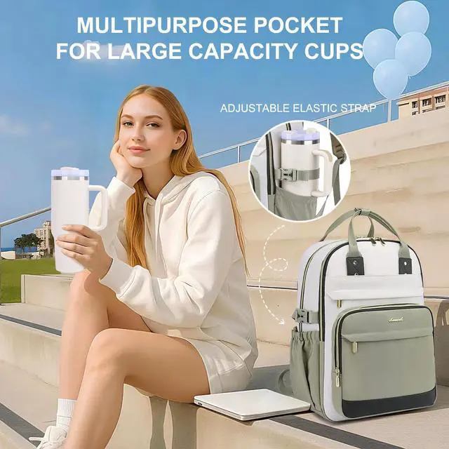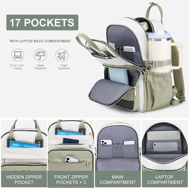 Large Capacity Backpack for WomenUpgraded college laptop backpack features trendy color combinations. STYLISH AND PRACTICAL. The large capacity bookbag includes 6 compartments and 17 pockets, helping you keep your travel items organized and making it convenient to store your laptop, iPad, clothes, A4 folders, water bottle, umbrella, wallet, work supplies, campus essentials, and other necessities.