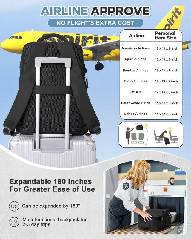 Carry-On Backpack for Women - With dimensions of 12.2 * 8.6 * 18.5 inches (approx. 312247 cm), this backpack meets airline carry-on requirements, helping you save on checked baggage fees. Its compact design fits perfectly under airplane seats, making it an ideal choice for travel and business trips. ^^ Spacious & Multi-Compartment Design - The main compartment can hold 5-8 pieces of clothing and travel essentials. The front compartment features multiple organizational pockets for quick access to notebooks, pens, earbuds, and other small items. A dedicated laptop sleeve, positioned close to your back, fits most 15.6 -inch laptops.