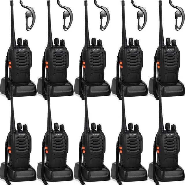Each walkie talkie is preprogrammed with 16 channels, can be used right out of the box, channel programmable with programming cable (sold separately). UHF Frequency range, 2 Watt output power. ^^ Any number of Ansoko two-way radios can be used together as long as they are on the same channel and within the available range, reception range 0.6 - 3.5 miles depending on the terrain. ^^ 1500mAh rechargable battery, supports 8-12 hours communication under typical use, each radio has its separate charging base, don't need to share charging base between two way radios.