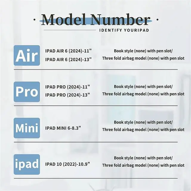 • Check Model for Pad: This case is only compatible with iPad Ipad Mini 8.3in/Ipad Air6 2024 11in13in, Ipad 2022 10.9inIpad 2024 Pro 11in 13in.Please check the back bottom of your Pad to find the model number.Note: It does not fit other models!
