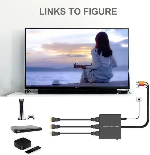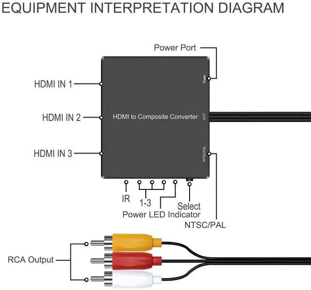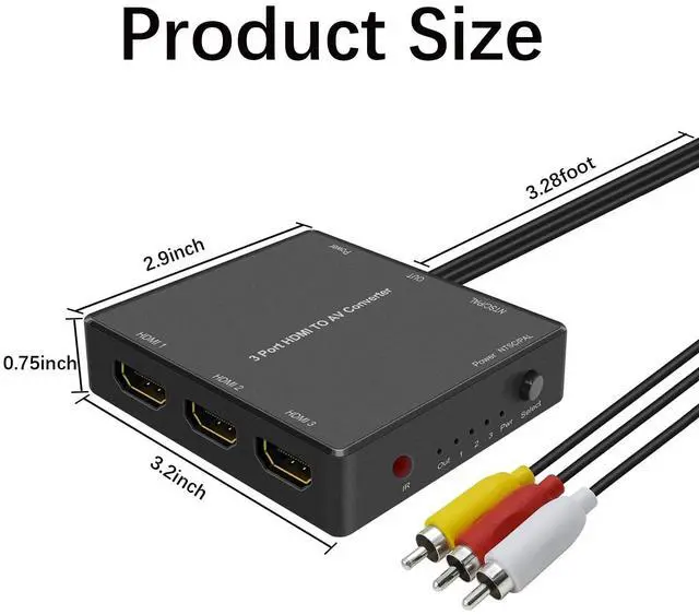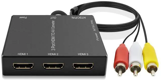 RCA converter: Convert 3 HDMI video signal to CVBS(AV/RCA/Yellow, White, Red) audio/video signal, avoid frequent plug-in replacement. ^^ HDMI to AV converter support HDMI 1.3, Input Resolution Up to 1080p (50@Hz/ 60@Hz) ^^ Connect 3 signal sources at the same time, you can use the infrared wireless remote control or the buttons on the device to easily switch the signal source input device ^^ Support NTSC and PAL two standard TV formats, please set as NTSC when you are in USA! ^^ HDMI to AV adapter is compatible with most HDMI signal sources, such as Fire Stick, Roku PS4, Appler TV, HD Play, PC, DVD players, etc.