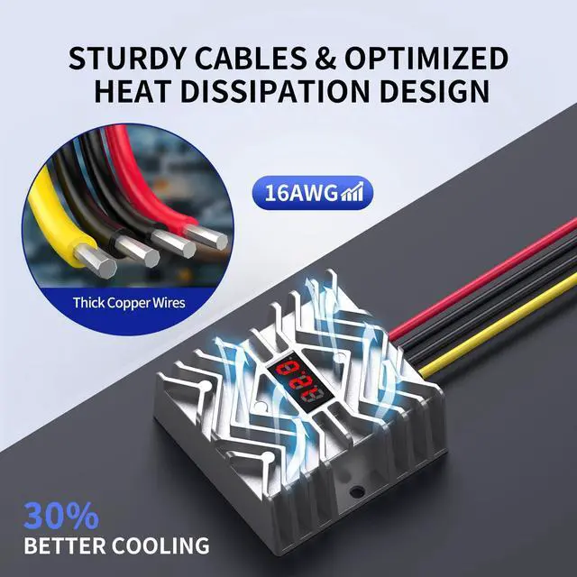 Note: 0.1V deviation is normal and does not affect performance. ^^ [MCU Safety Chip for Enhanced Protection] The MCU microcontroller ensures stable operation and protection. It continuously monitors the voltage and current from 24VDC to 12VDC, preventing overload, overvoltage, and short circuits. The MCU also triggers an integrated temperature control system to prevent overheating, enhancing both safety and reliability ^^ [Thicker CablesLess Heat Generation] Our 24V to 12V converter uses thicker cables designed to carry higher loads with minimal heat generation. These cables are significantly thicker than standard models, reducing resistance and improving both efficiency and longevity. The converter can handle a true 30A load for extended periodsup to half an hour or longermaking it an ideal and reliable choice for high-load systems like heavy-duty trucks and solar systems ^^ [Advanced Heat Dissipation with W-Shaped Fins] The heavy duty 24v to 12v step down converter 30a converter features a unique W-shaped fin design for advanced heat dissipation, efficiently releasing heat and keeping the system cool, even under heavy loads. The stylish aluminum alloy casing with geometric patterns further enhances the cooling process. This feature is especially beneficial for use in high-temperature environments and confined spaces.