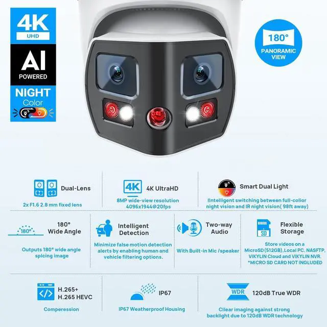 4K Ultra HD 180 Panoramic CameraThis 8mp dual-lens security camera is equipped with built-in 2 1/ 2.7" progressive scan CMOS, 2x 2.8 mm fixed lens and and F 1.6 aperture that provides very wide view. So you can see 180 degrees panoramic views ahead of you easily. perfect for surveilling vast outdoor areas. (TipsThis dual-lens camera is suitable for installation or debugging in large outdoor areas, and the distance is at least 4 meters, so that the monitoring picture will be clear. When testing the camera in a small indoor scene, the binocular monitoring screen will produce very obvious cracks, affecting the monitoring effect.