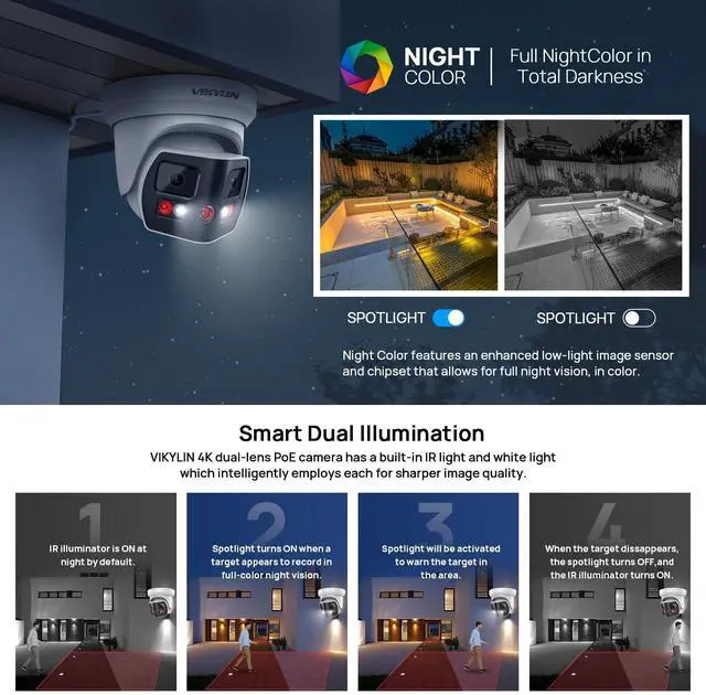 ) ^^ UHD 8MP Resolution & Smart Dual LightThis 8mp panoramic ip security camera has great imaging with 8mp resolution, Max. Resolution 20fps@4096 x 1944P. And this advanced 8mp ip camera has taken full color technology, can enhance color imaging in low-light conditions or at night. Smart Dual Light technology adopts smart algorithm to detect targets. Usually, when no human objects are moving, the infrared black and white night vision is maintained. When human movement is detected, the two warm light leds will light up, and the screen will immediately be converted to full color night vision, according to your own preferences, choose the light source that suits you.