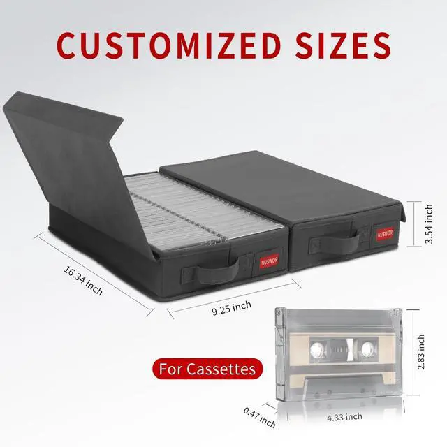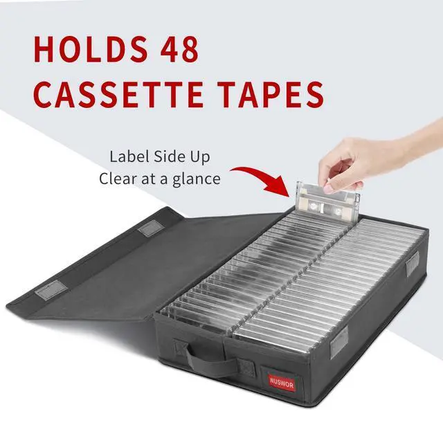Streamlined DesignFeaturing an organizer with a lid, this cassette tape case is stackable, saving space while ensuring your collection is accessible and tidy. ^^ Extensive CapacityEach cassette storage case remarkably fits up to 48 cassettes. Organize your precious collection efficiently and impressively. ^^ Sturdy ConstructionCrafted with thickened non-woven fabric and high-stiffness cardboard, this cassette tape carrying case promises long-lasting use and enhanced protection for your tapes. ^^ Protective HavenProtect your cherished cassettes from scratches and dust with our resilient cassette tape holder case. An isolation chamber for your beloved tapes! ^^ Organized BlissDesigned with categorized storage, this cassette tape box makes it effortlessly quick and easy to locate your desired tapes.