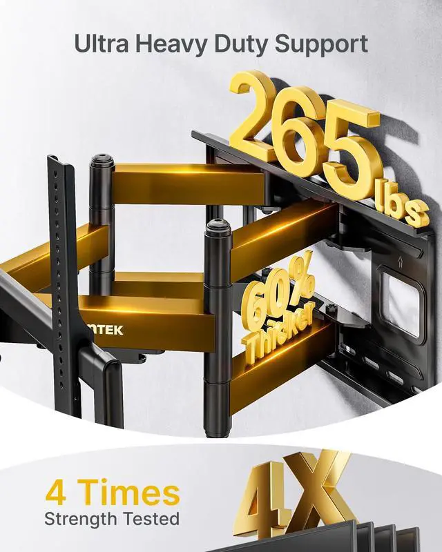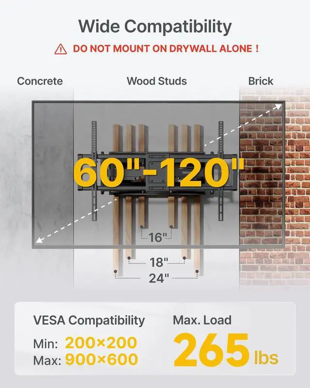 DESIGNED FOR MASSIVE TVs Engineered for extra-large screens from 60 to 120 inches, the monTEK heavy duty TV wall mount supports up to 265 lbs and has passed 4x load-bearing tests for unmatched strength. its reinforced dual-arm structure ensures rock-solid stabilityeven with 100"+ TVs fully extendedeliminating sagging or shaking for a secure, worry-free viewing experience. When fully retracted, the TV will only sit 2.95 inches from the wall, allowing for a sleek, low-profile look. Perfect for home theaters, gaming setups, living rooms, or commercial spaces. Enjoy a secure, stress-free mounting experience with unmatched strength ^^ VERSATILE COMPATIBILITY The monTEK XXL TV wall mount is built to support today's most popular LED, LCD, OLED, QLED, 4K & 8K TVs and compatible with Samsung, LG, Sony, TCL, Hisense.