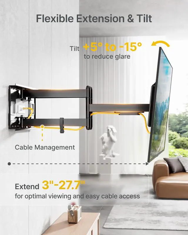 With universal VESA compatibility (200x200 to 900x600mm), it fits a wide range of screen sizesfuture-ready for upgrades. Mounts securely to wood studs (12"/16"/18"/24"), concrete, or brick walls, making it ideal for new installs or retrofit projects. A durable, flexible solution for evolving home theaters and entertainment setups ^^ FULL MOTION FLEXIBILITY 27.7" Extension ^^ 60 Swivel ^^ +5/-15 Tool-Free Tilt - Customize your viewing angle with ease. This full motion TV wall mount extends up to 27.7", swivels 60 for side-to-side flexibility, and features a tool-free tilt system that lets you adjust vertical angles without knobs or toolsperfect for reducing glare on large 4K or OLED screens.