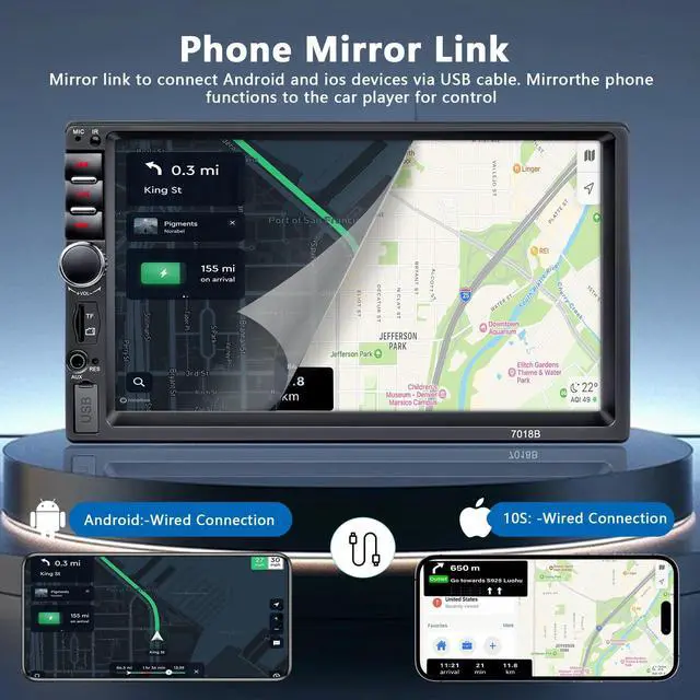 Bluetooth hands-free calling and FM radioThis double din car stereo features Bluetooth hands-free calling. It also supports FM radio. This double din car radio also offers a stereo mode where the in-car screen seamlessly connects to your car's factory sound system via Bluetooth transmission or auxiliary input, and all audio is played through your car's factory speakers. ^^ Mirror Link and Reversing CameraBy connecting your car radio with your cell phone, you can mirror the video while driving, allowing you to enjoy leisure on the road. In addition this product also features HD reverse rear camera, the car stereo receiver supports rear view function, which will automatically display the image when the vehicle is backing up.