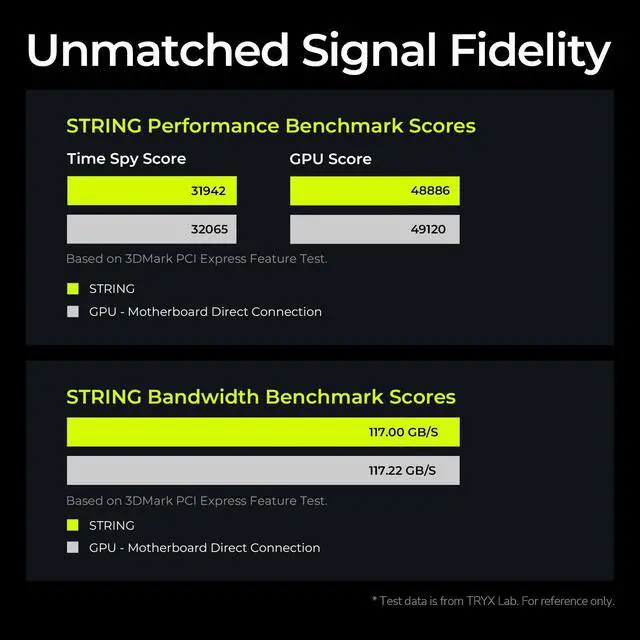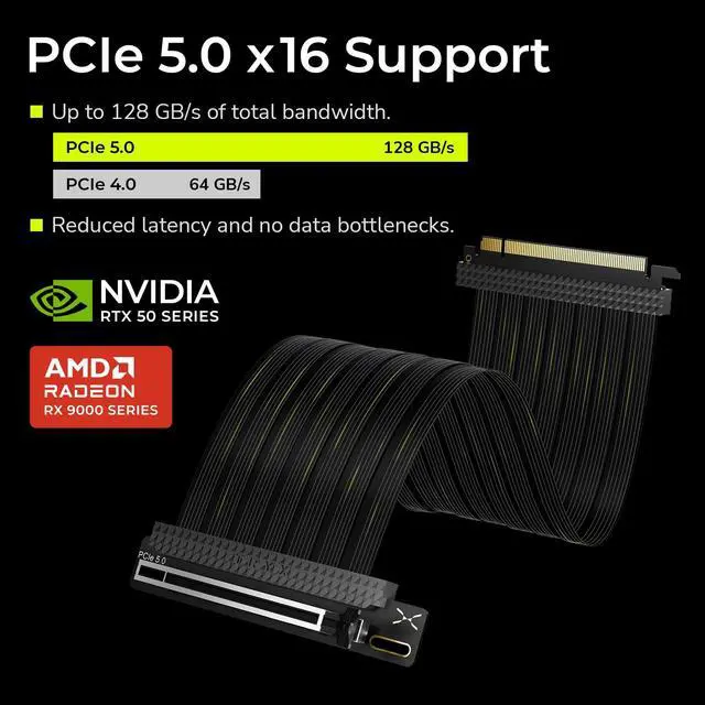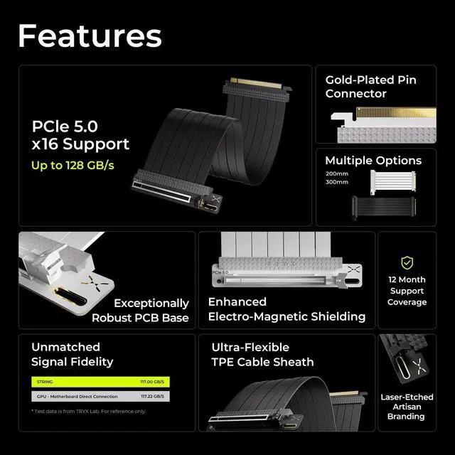 PCIE 5.0 X 16 RISER CABLE TRYX STRING riser cable 300mm supports up to 128GB/s bidirectional bandwidth, 2 faster than PCIe 4.0 (64GB/s). Optimized for RTX 50 series and RX 9000 series GPUs, delivering ultimate performance with ultra-low latency. ^^ NEAR-ZERO SIGNAL LOSS TRYX STRING PCIE 5.0 riser cable 300mm validated by 3DMark PCI Express Feature and Bandwidth Tests, which delivers stable high-speed transmission with near-zero signal loss even under extreme workloads. ^^ VERTICAL GPU MOUNTING Showcase your graphics card in a vertical orientation with stability and style. TRYX STRING PCIE 5.0 300mm riser cable Improves cooling efficiency while enhancing the aesthetics of your custom PC build.
