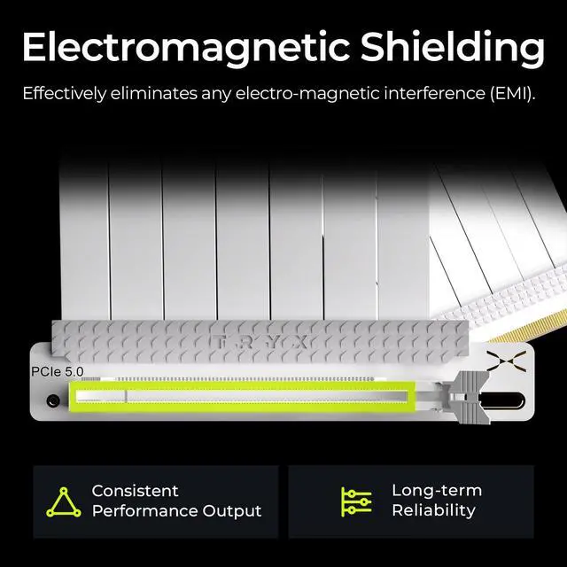 ^^ GOLD-PLATED CONNECTOR TRYX STRING PCIE 5.0 riser cable 300mm features premium conductive with gold-plated design that ensures long-term stability and reliable performance. Gold plating offers lower electrical resistance and better signal transmission. ^^ ENHANCED ELECTROMAGNETIC SHIELDING TRYX STRING PCIE 5.0 300mm riser cable effectively blocks EMI and signal noise from nearby power modules, RGB headers, and other components, ensuring stable, high-performance operation. ^^ PREMIUM PERFORMANCE DESIGN Ultra-flexible TPE cable of TRYX STRING enables effortless installation in tight builds. A 6-layer industrial-grade PCB base reinforces durability and enhances long-term stability and performance.