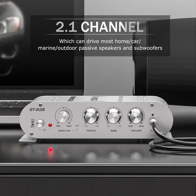 Mini Size but Powerful-- Don't be fooled by its size, itll give your entertainment system a serious boost. With 2.1 channel output RMS 20W2(L/R)+40W (subwoofer), which can drive most home/car/marine/outdoor passive speakers and subwoofers, and with excellent sound. Low distortion, acoustically accurate reproduction of music, which sounds smooth and full. ^^ Bass & Treble & Sub Vol Control-- Designed with main volume, treble and bass control knobs, Which for more delicate adjustment of the sound, much fun and high playability. Besides main volume, treble and bass control, sub volume control is specially designed.