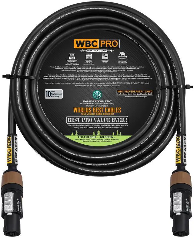 These high-value, high-quality cables will not break your bank and the integrity of your creative process. With WBC-PRO you are buying a product made with love and the utmost care for quality. WBC-PRO, the only cable you will ever need! ^^ The brand of connector used for this cable assembly: NL2FXX-W-S is the latest & the highest-end two-pole SpeakON offering by Neutrik AG- Liechtenstein, the world's leading brand for professional audio connectors. It sports a reliable twist-locking system, thermoplastic housing & Silver-plated Copper-alloy connectors. Offering the most reliable loudspeaker connections, the plugs can support 6mm to 12mm wide cables & have an IP20 rating. ^^ All our cables are professionally soldered using WORLDS BEST CABLES proprietary 4% silver solder blend & a nitrogen-assisted soldering process unique to us, exceeding industry standards, improves integrity of solder joints over traditional methods. ^^ These cables are lovingly assembled by WORLDS BEST CABLES, we offer the largest array of custom-built cables in the market, we carry all the major cable and connector brands. We have served millions of customers with quality assemblies for many years - this sale is for a single 20 Foot long cable.