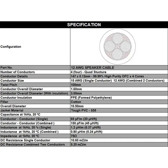 WBC-PRO-SPEAKER-12AWG, Star-Quad (eliminates EMI noise), Ultra-flexible, Professional-grade cable is a top-of-the-line solution for super-durable speaker cables. Low Capacitance & Resistance are ideal for long cable runs while still delivering Higher-Highs and Deeper-Lows. The cable sports 147 x 0.12 mm High-Purity ( 99.99 %) Oxygen Free Copper (OFC) Strands per Core. Suitable for even the most demanding situations (UV Protected Tough PVC Jacket) & superior to Industry leaders like Canare 4S11. ^^ WBC-PRO cables are designed based on science, engineered & manufactured in-house to the highest quality in the industry, and sold at prices that are unbeatable by the pro competition.