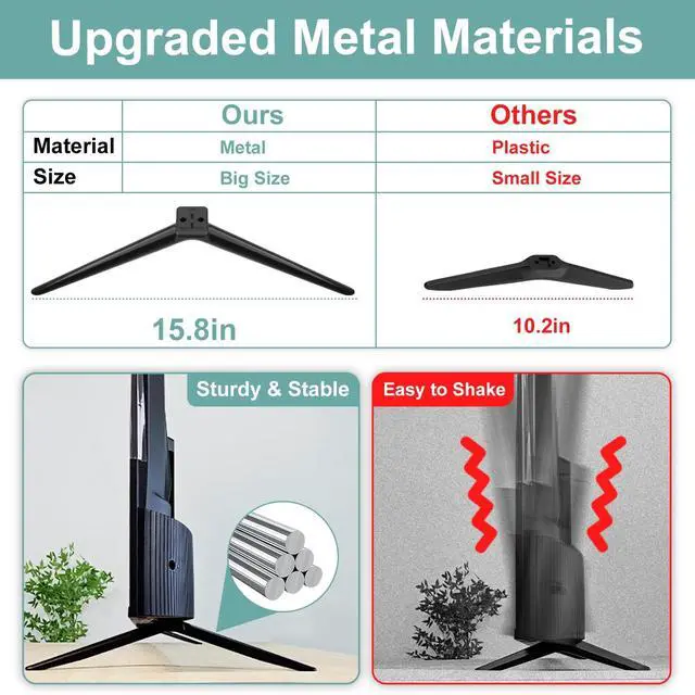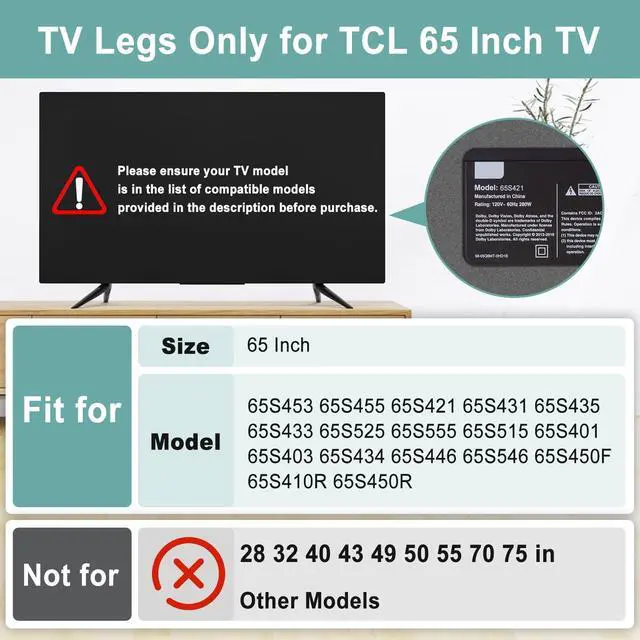 Important Notes: Only for TCL 65" we listed models! NOT universal TV legs! It's important to verify that your TV model is included in the list of compatible models provided in the description. This step will save you time and prevent unnecessary returns. ^^ Compatible Models -- TV stand legs for TCL Roku TV 65S453 65S455 65S421 65S431 65S435 65S433 65S525 65S555 65S515 65S401 65S403 65S434 65S446 65S546 65S450F 65S410R 65S450R. ^^ Easy to Install -- Installing these TV legs is a breeze. Within minutes, your TV will be securely supported. No need to hire expensive professionals for help. ^^ High Quality Metal Material -- Crafted from high-quality metal materials, our TV stand guarantee long-lasting durability and performance, eliminating concerns about instability. It's capable of supporting TVs weighing up to 200 lbs, providing ample strength. ^^ No Drill Installation -- Stand for Roku TV stand legs eliminates the need for drilling into your walls, sparing you from any potential damage or unsightly holes, ensures you can maintaining the pristine condition of your wall.