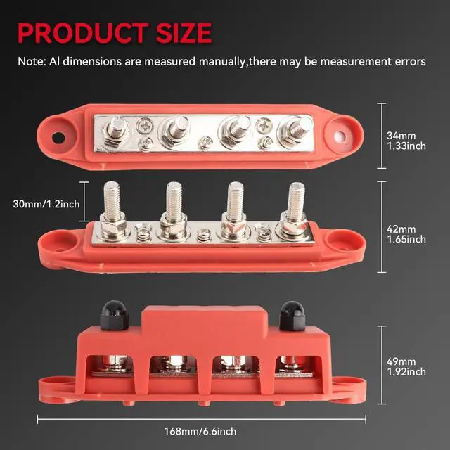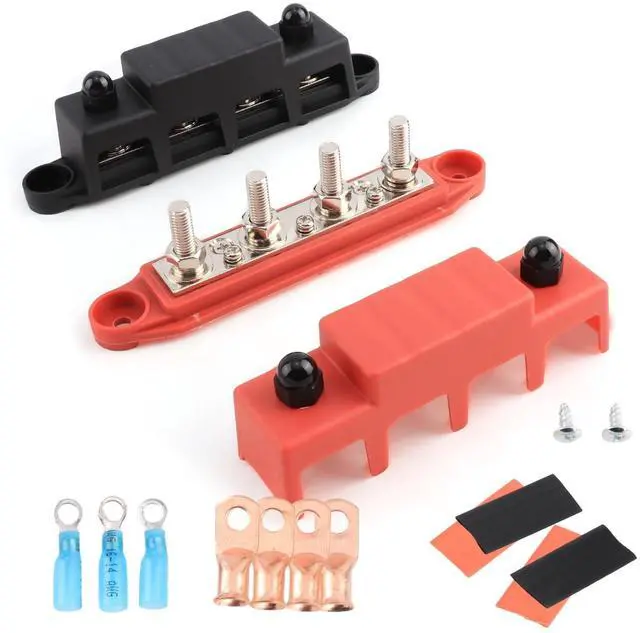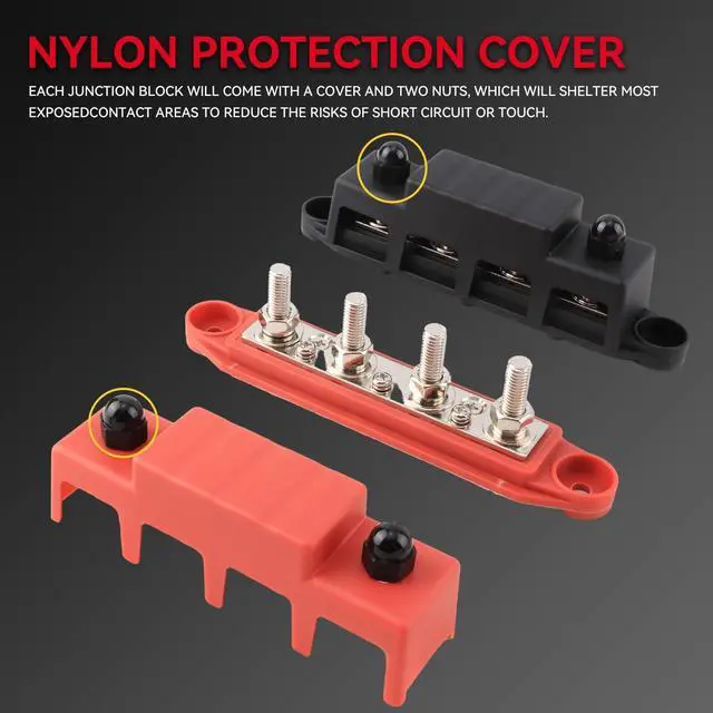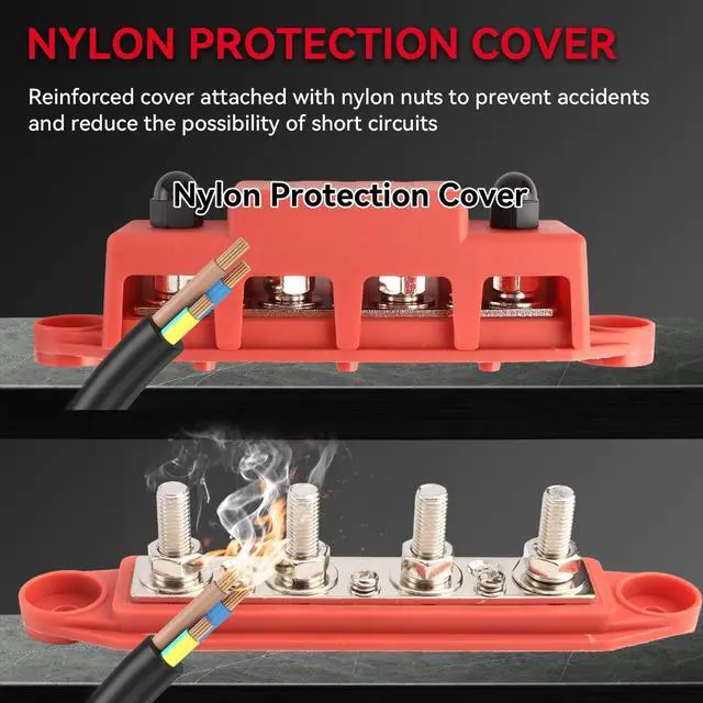 Maximum intermittent: 20A for each connection (less than 1 minute). So whether your working on a boat, a car, or an RV, we've got you covered. ^^ Built for SafeNickle plated brass busbar plates offer low resistance, maximum conductivity, and corrosion protection. The nylon nuts connect to two external studs to prevent accidental short circuits. A removable Nylon cover keeps metal components from making contact with anything. The insulated nylon base is flame-retardant. ^^ Distribute Power More Efficiently Provides several large gauge connections for running a dedicated ground to the battery and offers more minor gauge connections for lower voltage. ^^ Wide Applications DaRui bus bar is an excellent circuit collection wire Harness in the car, RV, yacht, caravan, and ship power system. The busbar holds wide cables securely to keep the wires neat.