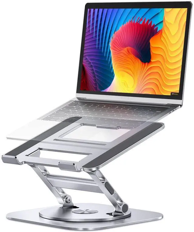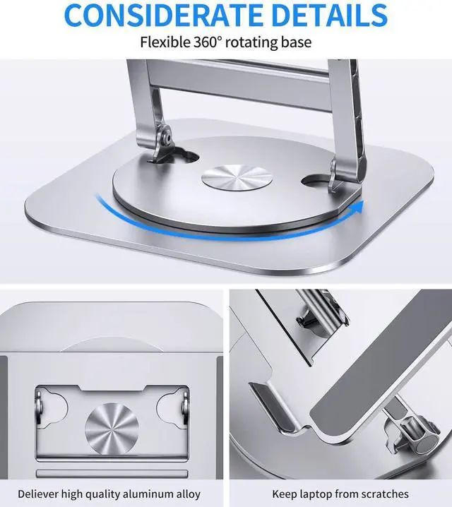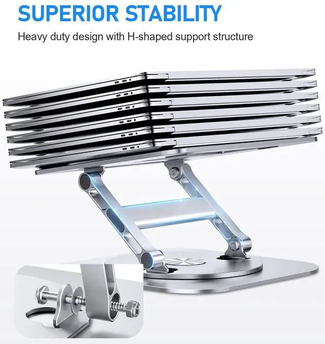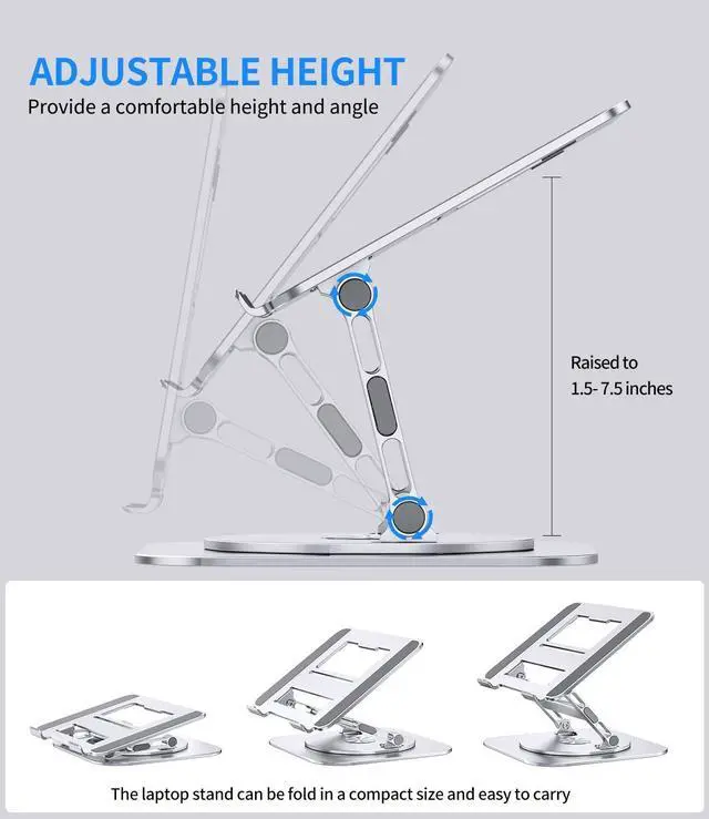 360 Degree Rotation with Sturdy SupportThis laptop desk stand can rotates on its centered round base, allowing the top half of the stand to rotate infinitely in either direction. This give you plenty of flexibility in terms of working position. It will be especially useful for group projects or meetings. What's more, featured with sturdy H-shaped support structure which make it more stable than normal laptop stands. ^^ Adjustable Laptop StandThis computer stand is designed with adjustable in height and angle, so you can raise your laptop screen to a more ergonomic viewing height which is better for maintaining a healthy posture.