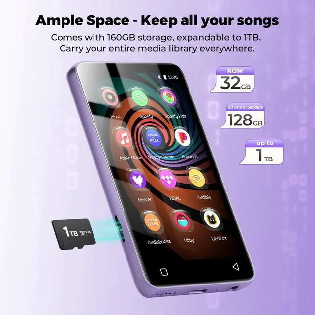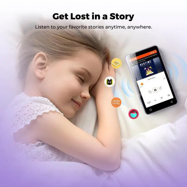 Online Music: The MP3 player arrives pre-loaded with a plethora of popular music apps, such as Spotify, Pandora, Music, Spotify Kids, Tidal, and Deezer. This MP3 serves as an excellent option for individuals seeking a specialized MP3 player or the convenience of streaming music through Wi-Fi, without the necessity of owning a smartphonemaking it particularly ideal for kids who are not yet ready for one. ^^ Take a break with a good book- This MP3 player with Bluetooth and WiFi comes pre-loaded with popular audiobook apps like Audible, Libby, and Audiobooks. Kids mp3 player is the perfect way to wind down after a long day. Plus, audiobooks are a great way to give kids' eyes a screen-time rest while still encouraging a love for stories and learning.