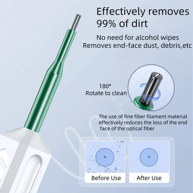 More than 800 cleaning timesThe optical fiber cleaning pen is easy to operate and has outstanding cost performance. More than 800 cleanings, lowering your cost per clean while maintaining results. ^^ Highly efficient removal of stainsNo need to wipe with alcohol, just 1 touch can remove dust, oil, etc. from the fiber end face, rotateing 180for a full sweep, can effectively remove dust and oil. ^^ Easy to operateOne touch design, One press can complete the cleaning and automatically replace the cleaning filament, can effectively ensure that the cleaned end surface is free from secondary pollution.