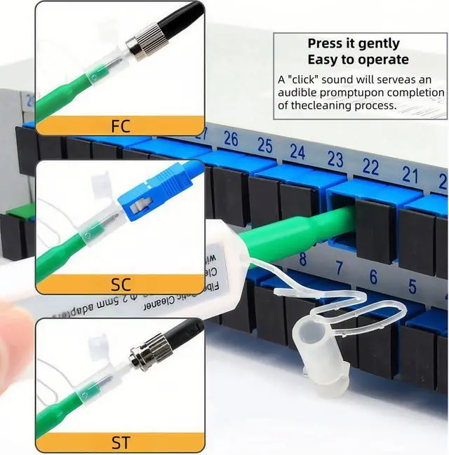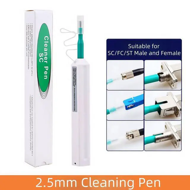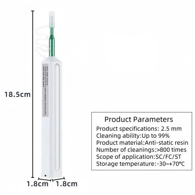 There will be a "click" sound when the cleaning is complete. ^^ MaterialMade of anti-static resin, effectively reduce the loss of the end face of the optical fiber. ^^ ApplicationOur Fiber Optic Cleaing Pen Suitable for cleaning SC/FC/ST 2.5 mm connectors.